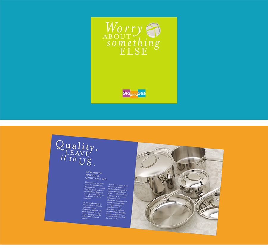 Ski and Sea provides housewares service for the timeshare industry. Sometimes an identity can be as simple as a consistent type treatment supported by a set of graphic elements and an attitude. Ski and Sea’s branding is characterized by a palette of bright colors – there are no official logo colors – and by always cropping images into a square, to reflect the three squares of the logo.